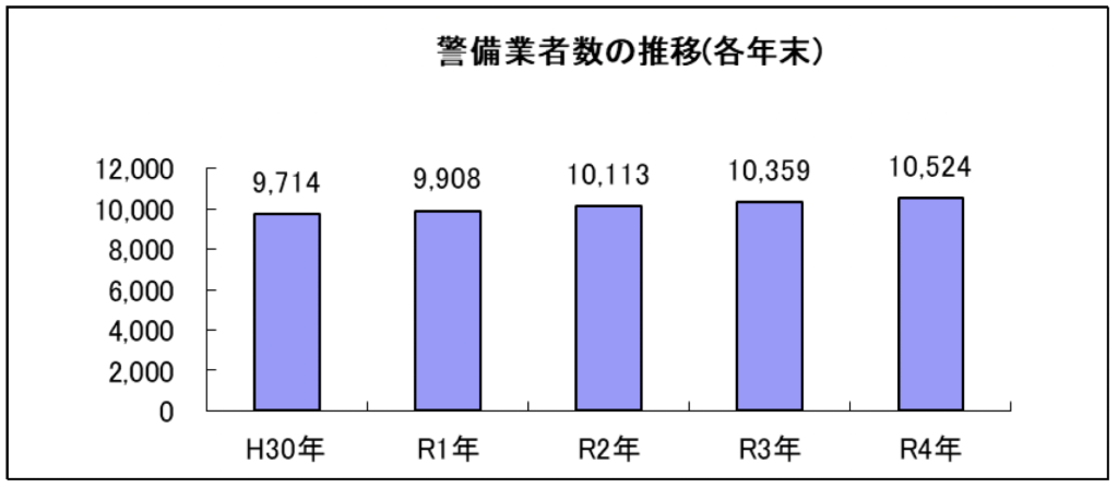 令和に入り、警備業の数は増加中で今や1万社あります。社会不安が高まり、治安が悪化している中、今後もますます警備業の需要は増加することでしょう。